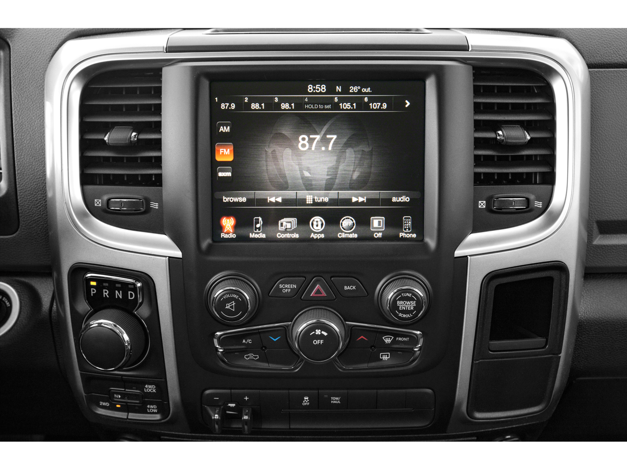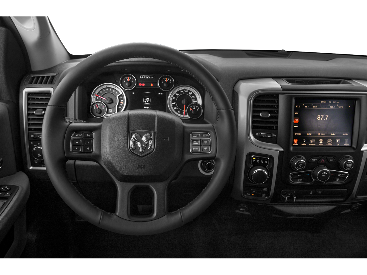 Quick Order Package 28Z Big Horn: Full Size Temporary Use Spare Tire; Leather Wrapped Steering Wheel; Fog Lamps; Steering Wheel Mounted Audio Controls; Premium Cloth 40/20/40 Bench Seat; Bright/bright Billets Grille; P275/60R20 BSW AS Tires; Locking Lug Nuts; Big Horn Regional Package; Electronic Shift on Demand Transfer Case; Dual Rear Exhaust with Bright Tips; 20" X 8" Aluminum Chrome Clad Wheels; Big Horn Badge; Class IV Receiver Hitch. Cold Weather Group: Engine Block Heater; Winter Front Grille Cover. Comfort Group: Heated Front Seats; Heated Steering Wheel. Luxury Group: Leather Wrapped Steering Wheel; Exterior Mirrors with Supplemental Signals; Rear Dome with On/off Switch Lamp; Underhood Lamp; Steering Wheel Mounted Audio Controls; Exterior Mirrors Courtesy Lamps; Glove Box Lamp; Ash Tray Lamp; Rear View Auto Dim Mirror with Microphone; Auto Dim Exterior Mirrors; Power Folding Mirrors; Power Heated Fold-Away Mirrors; Sun Visors with Illuminated Vanity Mirrors; Electroluminescent Instrument Cluster; Overhead Console with Garage Door Opener. Remote Start and Security Group: Remote Start System; Security Alarm. Protection Group: Tow Hooks; Transfer Case Skid Plate Shield; Front Suspension Skid Plate. Trailer Tow Mirrors and Brake Group: Trailer Brake Control; Power Black Trailer Tow Mirrors. Rear Camera and Park Assist Group: ParkView Rear Back-Up Camera; ParkSense Front/rear Park Assist System. Quick Order Package 26Z Big Horn. Uconnect 8.4A AM/FM/SXM/BT Radio. ParkSense Front/rear Park Assist System. Anti-Spin Differential Rear Axle. 9 Amplified Speakers with Subwoofer. Trailer Brake Control. ParkView Rear Back-Up Camera. Single Disc Remote CD Player. Rear Window Defroster. **Equipment listed is based on original vehicle build and subject to change. Please confirm the accuracy of the included equipment by calling the dealer prior to purchase.**